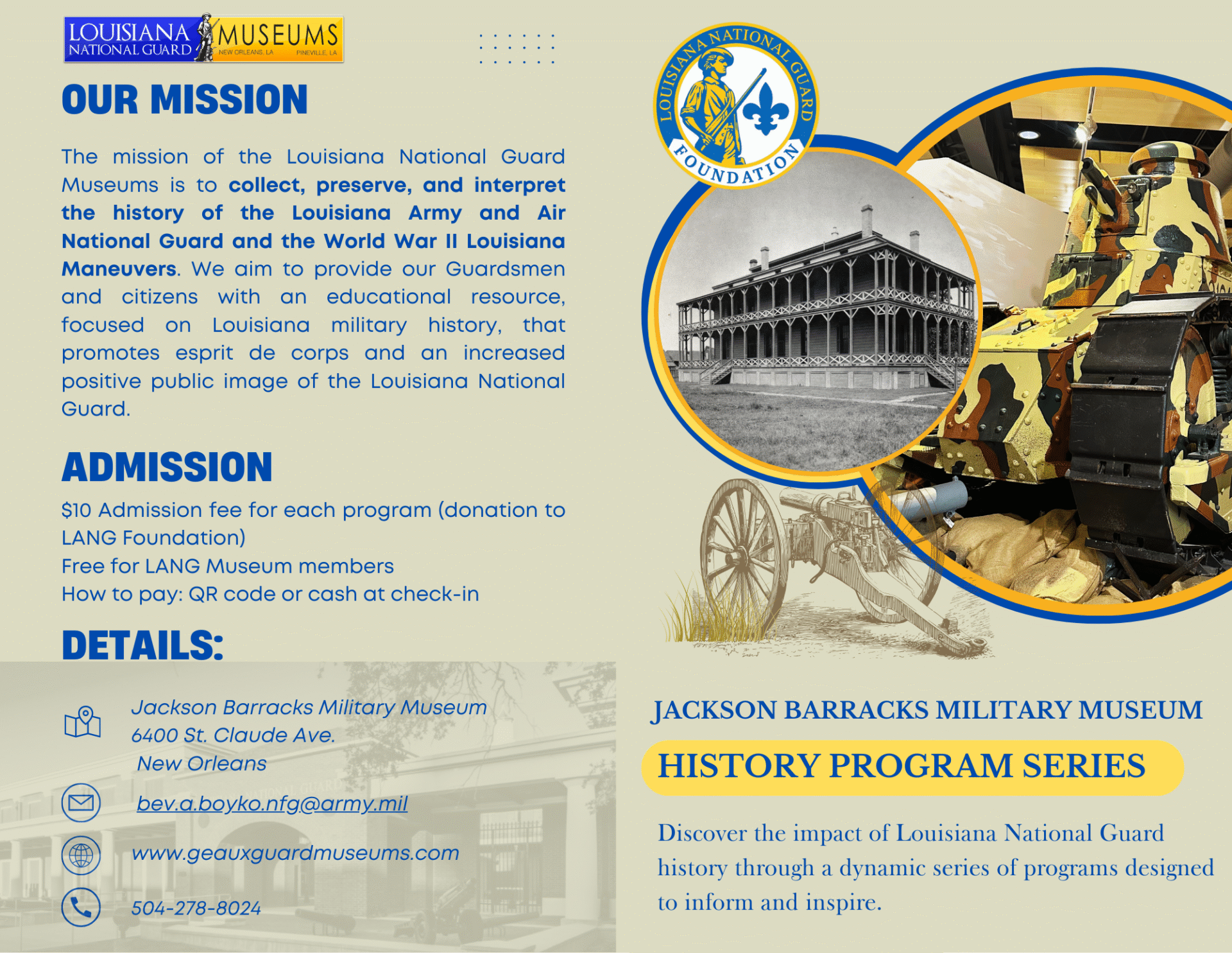 The Mission of the Louisiana National Guard Museums is to collect, preserve, and interpret the history of the Louisiana Army and Air National Guard and the World War II Louisiana Maneuvers. We aim to provide our Guardsmen and citizens with an educational resource, focused on Louisiana military history, that promotes Esprit de corps and an increased positive public image of the Louisiana National Guard.