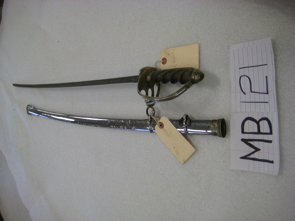 Sabre/ Army Officer's/ 1902 pattern/ Pommel,Knuckle Bow, and Quillon are nickel plated/ Blade is polished steel badly corrodede/ engravings on both sides of blade are rustted over/ single edged blade is fullered on both sides/ nickel plated scabbard has two carring rings/ drag is well formed